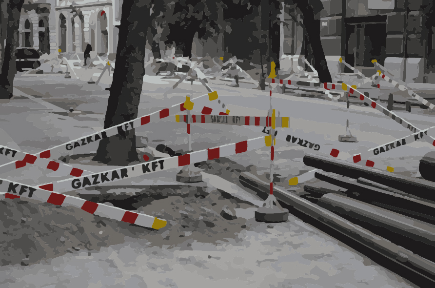 das Bild zeigt eine Straße in der ungarischen Hauptstadt Budapest. Es werden Leitungen verlegt, vielleicht Leer-Rohre für neue Kabel. Es geht um Infrastruktur für die Häuser, bzw. die Bewohner und Bewohnerinnen.