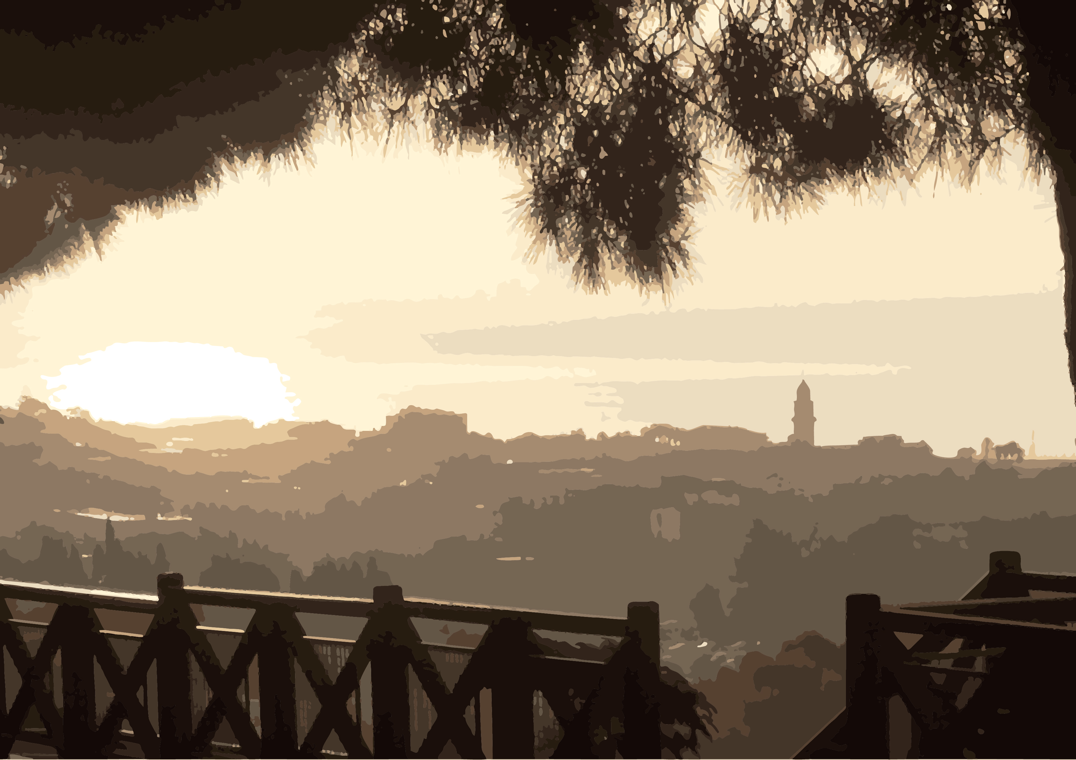 ein Blick über einen italienische Küstenort. Umrahmt von dem Ast einer Zeder liegt das offene Meer, auf dem sich das gleißende Licht der untergehenden Sonne spiegelt.