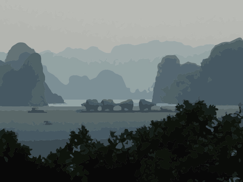 ein Schleppverband in der Hallong-Bucht an der Küste von Vietnam. Transportiert werden Elemente einer technischen Großanlage. Wozu die Teile dienen, bleibt Spekulation.