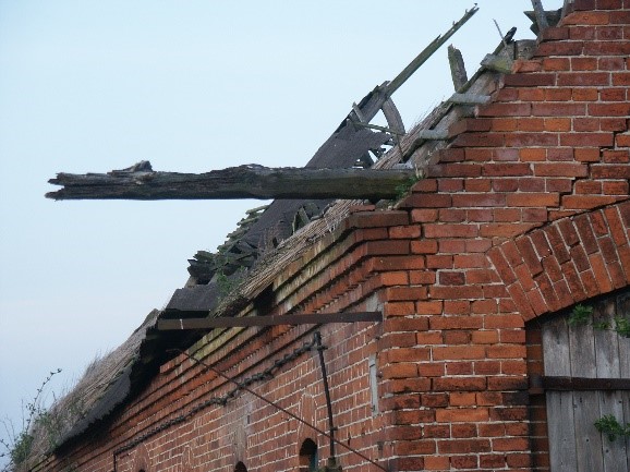 die Ruine eines alten Bauernhauses. Der Dachstuhl ist weitgehend zerstört. Einer der großen Balken ragt am oberen Ende der Fassade in die Luft. Der Mörtel zwischen den roten Backsteinen ist unregelmäßig oder fehlt ganz. Über einen der Fenster an der Stirnseite bricht das Mauerwerk.
