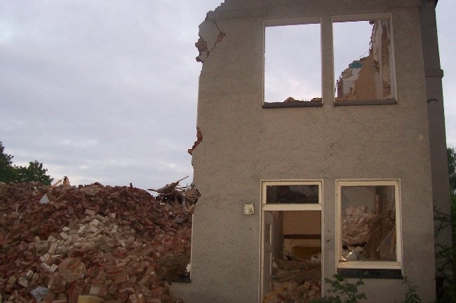 ein Abbruchhaus in einem späten Stadium. Nur noch eine Ecke scheint intakt zu sein. Noch unversehrt eine Haustür und ein paar Fenster, aber längst ihrer Funktion beraubt. Hinter der Türe nur Schutt, hinter den Fenstern blauer Himmel. Doch die Reste wirken stolz, nicht resigniert. Ein Untergang in Würde.