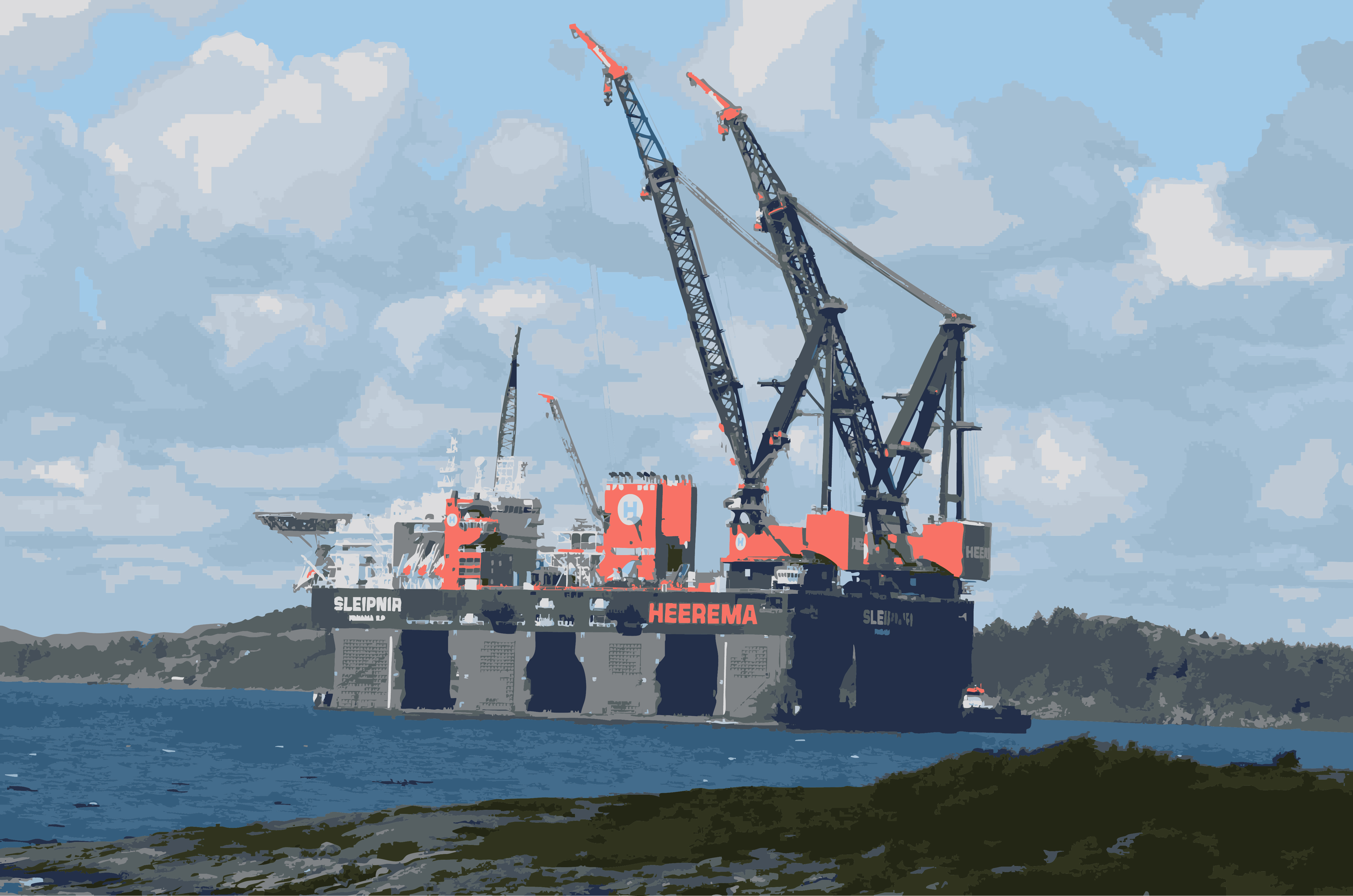 ein großer Schwimmkran in einer Bucht liegend. Aus dem blauen Wasser erhebt sich ein schwarz-rot-weißer Stahlkoloss. Auf acht Schwimmkörpern liegt eine Plattform mit zwei Großkränen und mehreren kleineren Anlagen zum Heben von Lasten. Die beiden Ausleger der Hauptkräne weisen parallel nach innen. Sie sind offenbar in Ruheposition. Die anderen Aufbauten erwecken ebenfalls den Eindruck, dass gegenwärtig die Arbeiten ruhen. Die Gesamtanlage dominiert die Bucht. Vor und hinter dem schwimmenden Riesen liegen Landmassen, die offenbar auch vor dem Wellengang des offenen Meeres schützen. Die Beschriftungen "HEEREMA" und SLEIPNIR" ließen eine Recherche zu, um welche Art von Anlage es sich handelt.