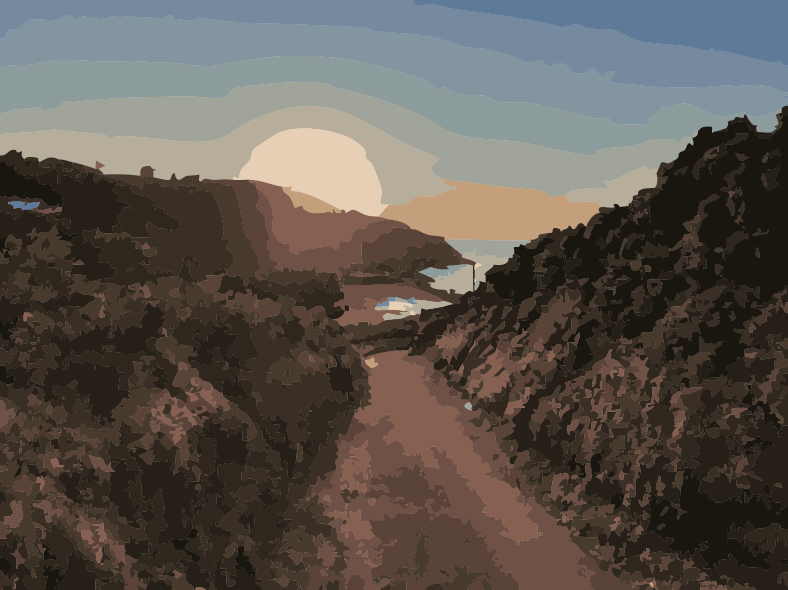 ein Weg zum Meer bei Sonnenuntergang. Alles ist vom rötlichen Schimmer in ein besonderes Licht getaucht. Der Weg führt zunächst gerade abwärts zum Wasser und beschreibt dann eine Kurve. Von hier aus ist nicht zu sehen, wo er endet oder wohin er weiterführt. Unten am Meer ist ein steiniger Strand, ein Stück Uferbefestigung und ein kleines Gebäude auszumachen. Das Meer trägt eine helle Oberfläche. Die Hügel drumherum sind von niedrigem Gebüsch bedeckt. Die Sonne schaut noch gerade so über eine Landzunge. Bald wird sie verschwunden sein.