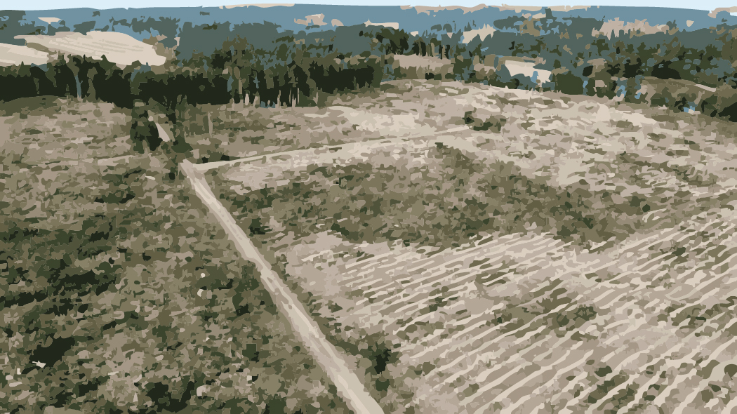 eine große gerodete Fläche aus der Luft. Die Bodenbeschaffenheit ist in verschiedenen Arealen unterschiedlich. An manchen Stellen ist trockene Erde zu erkennen, in der Furchen wie auf einem Acker gezogen sind. An anderen Stellen liegen noch Geäst und andere Baumreste. Wieder woanders wächst niedriges Gebüsch. Insgesamt erweckt das Gebiet den Eindruck massiver Zerstörung. Der Mensch hat eingegriffen und die Bäume beseitigt, offenbar mit schwerem Gerät. Dazu wurden die Wald- oder eher Wirtschaftswege genutzt. Angrenzend ist noch intakter Wald zu erkennen. Erfreulich tiefes Grün zeigen die Baumkronen.