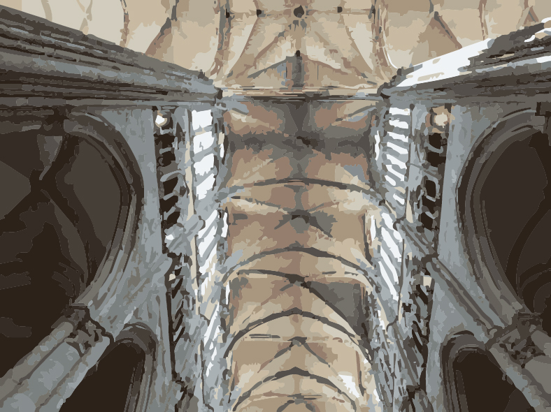 ein Blick nach oben in einer Kathedralen-ähnlichen Kirche. Die Decke in großer Höhe ist streng symmetrisch gestaltet. Die Kombination aus Bögen und Rundungen erinnert fast an den Faltenwurf von Textilien. Es sind helle Pastelltöne, die die Decke locker und leicht erscheinen lassen. Unter der Decke fällt aus Seitenfenstern Licht in den Kirchenraum. Etwas düsterer wirken die Seitenschiffe, die aber ebenfalls in ihrer Gestaltung nach oben streben. Alles ist in Harmonie aufeinander abgestimmt. Enormer Aufwand an kreativer Gestaltung und materieller Umsetzung sind hier kombiniert.
