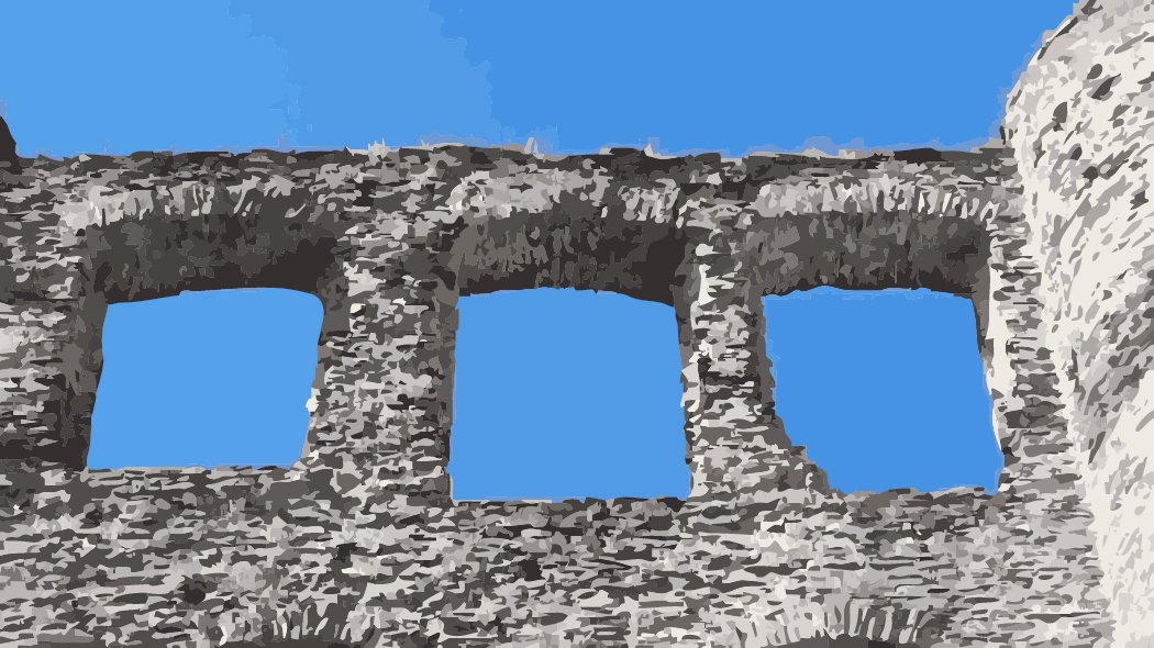 ein altes Gemäuer mit drei Aussparungen für Fenster. Die rund einen halben Meter dicken Mauern sind aus Bruchsteinen gefertigt, nicht aus gebrannten Ziegeln, wie es andernorts oder zu anderen Zeiten üblich war. An den Fenstern erkennt man die hohe Kunst, auch ohne Querbalken Fenster zu errichten. Die Steine sind so platziert, dass ihr eigenes Gewicht Stabilität erzeugt. Alle drei Fenster weichen in den Maßen voneinander ab. Das mittlere ist das größte Fenster, beim rechten fällt auf, dass eine der Ecken nicht ausgeformt ist. Das rechte Fenster wirkt insgesamt jüngeren Datums, das Gestein ist einwenig heller. Es handelt sich um eine Ruine. Ein Dach gibt es nicht mehr. Stattdessen wächst auf der Oberkante des Mauerwerks Gras. Die grauen Töne des Gesteins kontrastiert mit dem strahlenden Blau des Himmels.
