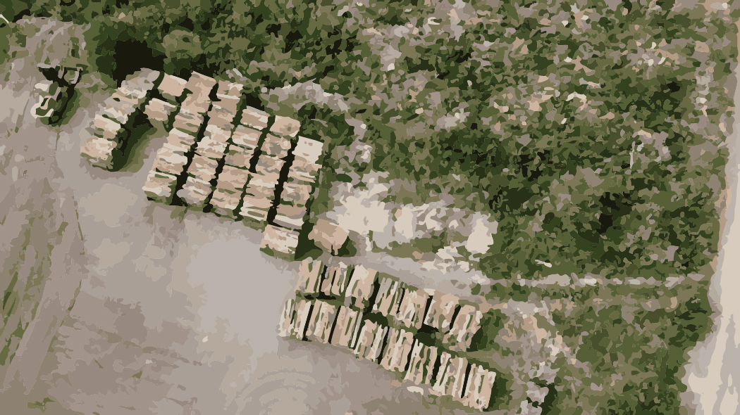 ein kleines Holzlager von oben. Auf einer planierten Fläche stehen in mehreren Reihen Stapel mit Baumstämmen. Sie sind einheitlich lang und in gleichförmig Portionen gepackt. Ein ehemaliger Wald wurde in Lieferpakete verwandelt, die nun offensichtlich auf den Abtransport warten. Spuren im Untergrund lassen auf Lastwagen schließen, die mit dem bereitstehenden Gabelstapler beladen werden. Es handelt sich um tote Ware, die nun einer finalen Verarbeitung zugeführt werden wird. Daneben aber hoffnungsvolle, lebendiges Grün, das zum Glück unzugänglich wirkt.