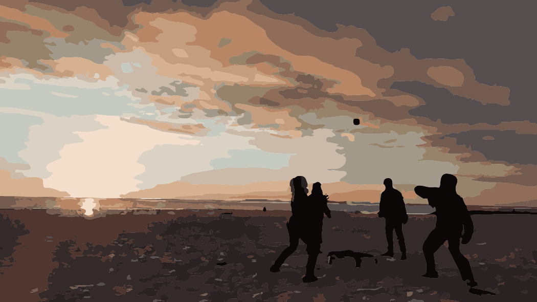 ein Ballspiel vor Sonnenuntergang am endlosen Strand. Vier Personen sind in Bewegung, fokussieren einen Ball, der sich gerade im Augenblick über und zwischen ihnen befindet. Spielende und Spielgefährten sind im Licht der untergehenden Sonne nur als Silhouetten sichtbar. Die Sonne steht knapp über dem Horizont, schickt Strahlen, die sich im Meer spiegeln und den Strand in diffusen Licht tauchen und die dicken Wolken, die über der Szenerie hängen, von unten beleuchten. Eine Abendszene, die sich in kurzer Zeit im Dunkeln auflösen wir.