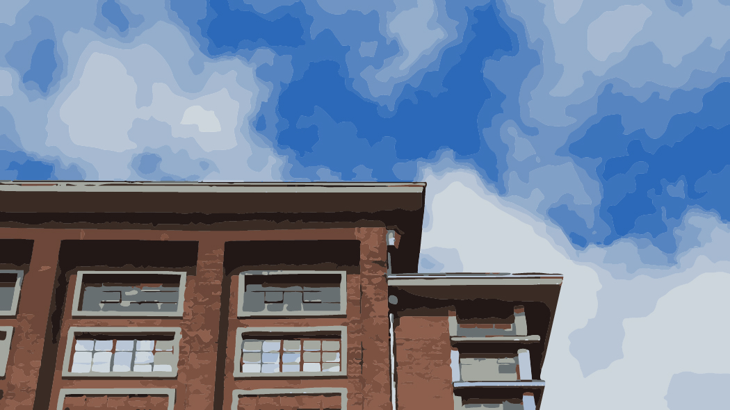 die obere Ecke eines großen Backsteingebäudes. Die Form und Gestaltung der Fenster lassen auf einen Industriebau schließen. Mauerwerk, Fenster und die sichtbare Kante des Flachdachs sind in einem guten Zustand, obwohl das Gebäude nicht neu und modern wirkt. Ein Teil der Fenster bestehen aus fünfzehn mattierten Einzelgläsern. In ihnen spiegelt sich dennoch schwach der blau-weiße Wolkenhimmel. Die Fenster sind mit grauen Schmuckelementen von den rot-bräunlichen Backsteinen abgesetzt. Auch das durch einen leicht vorspringenden Mauerverlauf geschützte Fallrohr befindet sich in einwandfreiem Zustand.
