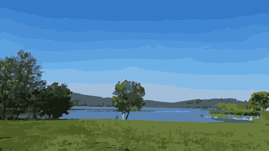 ein Naturidyll: eine Rasenfläche, Bäume, ein See, ein begrünter Höhenzug und ein wunderbar blauer Himmel. Alles wirkt in in seinen satten Farben in außerordentlicher Vitalität. Der Rasen ist in gepflegtem Zustand, die Baumgruppe und das Einzelexemplar stehen in vollem Laub und bilden am Seeufer einen Blickfang vor dem Hintergrund der weiten Wasseroberfläche. Der See liegt ruhig, nur in einigen Aralen kräuselt sich das Wasser leicht. Unmittelbare menschliche Gestaltung verraten nur die Uferbefestigung und fernab einige Häuser auf dem Höhenzug, der ansonsten dicht bewaldet ist. Darüber, am Horizont ist ein schmales Wolkenband auszumachen, das den ansonsten blauen Himmel nur dekoriert.