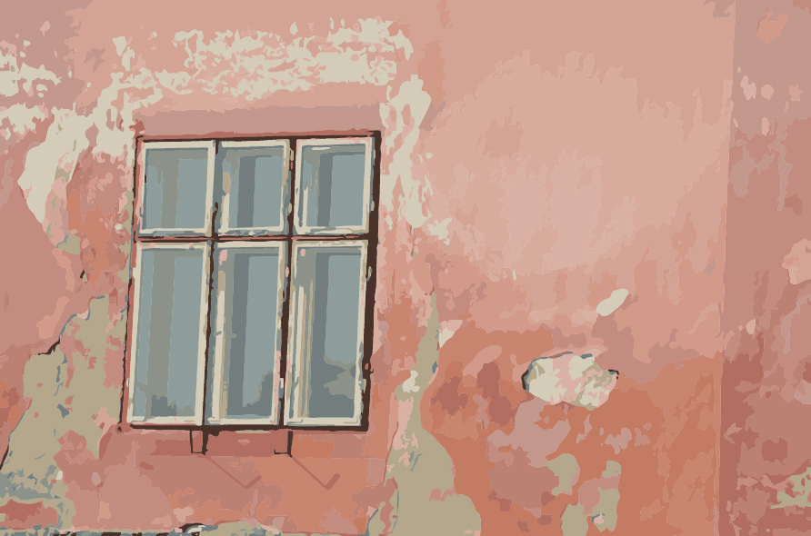 ein altes Fenster in ebenso betagter Fassade. Alles trägt die Spuren langer Beanspruchung. Der Putz an der Rosa-farbenen Außenwand ist an mehreren Stellen abgeplatzt, an anderen Stellen verraten Verfärbungen und Ausblühungen vorhandene, von unten emporkriechende Feuchtigkeit. Rund um das Fenster besteht eine in einem dunkleren Rosa gestrichener Umrahmung nur noch unvollständig. Das Fenster scheint aus Außen- und Innen-Elementen zusammengesetzt. Das Außenfenster besteht aus jeweils drei Scheiben und drei Oberlichtern, die von hellen Rahmen eingefasst sind und ihrerseits von einer dunklen, morsch wirkenden Rahmung eingefasst sind. Zwei Metallhalter wären in der Lage, einen Blumenkübel zur Dekoration des Fensters zu tragen.