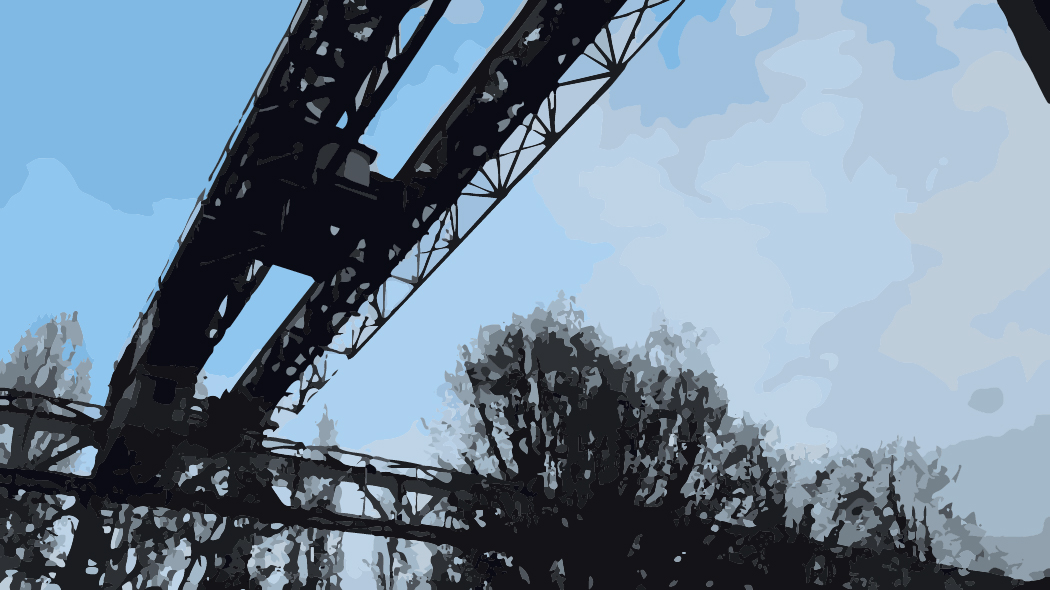 eine Stahlkonstruktion als Teil einer Industrieanlage. Die ineinander verschachtelten Träger wirken wie eine Apparatur zum Heben und Transportieren von Lasten. Es lässt sich denken, dass sich die Elemente in verschiedene Richtungen manövrieren lassen, indem sie jeweils über Schienen laufen. Die massive Bauweise mit sich gegenseitig verstärkenden Stahlelementen lässt auf den Transport schwerster Güter schließen. Durch die Lichtverhältnisse erscheinen sowohl Stahlkonstruktion als auch die Bäume im Hintergrund Silhouetten-artig wie ein schwarzes Ensemble aus Technik und Natur.