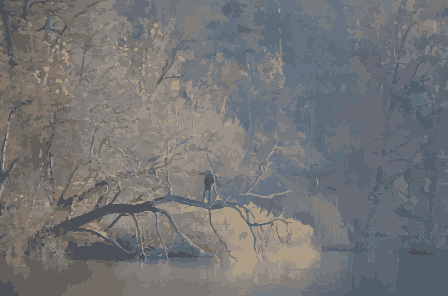ein Baum, der in Schieflage in einen See hineinragt und in dessen Krone sich eine Person aufhält. Eine herbstlich-winterliche Atmosphäre mit gedeckten Farben ins Dunkelgrüne und Bräune. Der Baum ist abgestorben, trägt auch kein Herbstlaub mehr wie die anderen Bäume, die am Seeufer stehen. Vollkommen kahl das Geäst. Es fehlt nicht viel und dann wird er gänzlich in den See hineinkippen. Die Person nutzt den Absturzbaum als exponierten Aussichtspunkt. Sie kann den See und das Ufer überblciken und ihrerseits von vielen Seiten gesehen werden. Die ungewöhnliche Kombination aus einer Besonderheit der Natur und dem unkonventionellen Agieren eines Menschen.