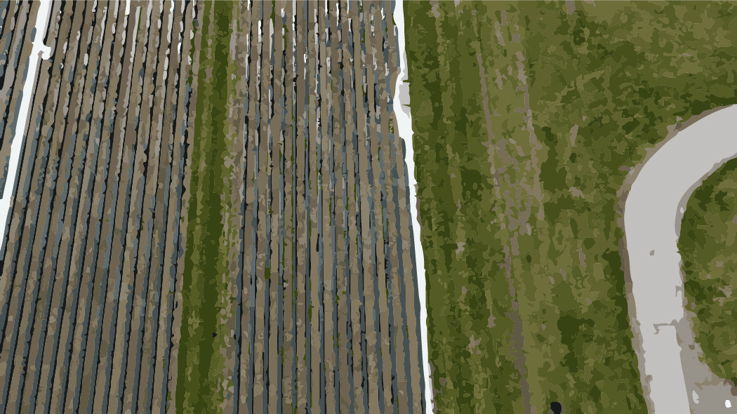 Ackerflächen und ein asphaltierter Feldweg aus der Perspektive von oben. Die Elemente sind geometrisch angelegt, Flächen und gerade wie gekrümmte Linien. Über die Hälfte des Bildes nimmt ein Feld ein, das eng beieinander liegende, aber dennoch klar unterscheidbare Reihen aufweist. Die beiden weißen Linien rechts und links könnten Folien sein, die nun beiseite gelegt wurden, weil sie ihre Pflicht erfüllt haben. Daneben ein Feld, das üppig bepflanzt ist, aber keine Reihungen aufweist. Bodendecker die Pflanzen, die aus der Saat hervorging. Zu sehen sind ansatzweise die Spuren der Traktoren. Der Asphaltweg macht eine starke Biegung und führt von den Feldern weg in eine andere Richtung.