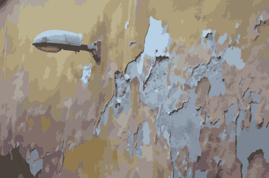 eine Lampe an einer Hauswand. Es handelt sich um eine Straßenlampe mit einfachem grauen Gehäuse, dessen Oberfläche mit der Zeit stumpf geworden ist. Die Birne wird zum Schutz von einem Glas abgedeckt. Der Halt an der Wand wird durch ein Gehäuse gewährleistet, das mehrfach mit der Wand verschraubt ist. Die Stromversorgung verläuft in oder durch die Mauer. Die Wand ist in einem ins Rosane gehenden Pastellton gehalten. Der Ober-Putz ist an mehreren Stellen abgeschaltet und gibt den Blick auf einen grauen Untergrund frei. Der Wechsel von unterschiedlich beschädigten Flächen mit gezackten Rändern erinnert an die Länderkarten eines Geografie-Atlas.