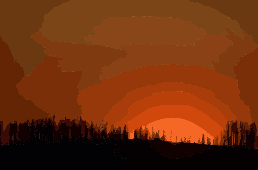 ein Bergkamm, hinter dem die Sonne untergeht. Der Kamm verläuft fast streng horizontal. Er ist in unterschiedlicher Weise bewaldet. Zum Teil stehen die Bäume dicht nebeneinander und wirken gesund und kraftvoll. Gerade da, wo der kleine Rest der Sonne sichtbar ist, stehen nur vereinzelte Bäume, die krank und mickrig wirken. Alles ist nur als Scherenschnitt erkennbar, im scharfen Kontrast zwischen dem Schwarz des Bergrückens und seiner Vegetation und dem tiefen Rot des Abendhimmels. In wenigen Augenblicken wird das Spektakel vorüber sein. Dann wird die Nacht einkehren, die Konturen verschwimmen und alles in Finsternis eintauchen.