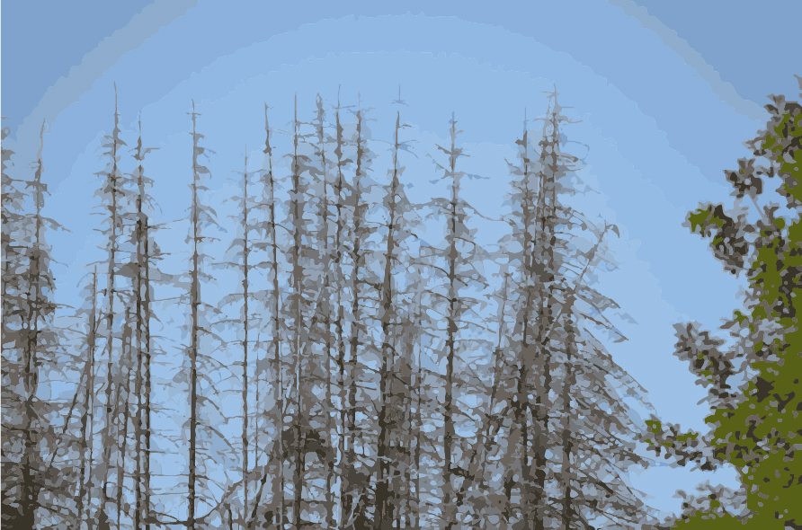 die von Schädlingen befallenen Bäume, beziehungsweise das, was von ihnen übrig geblieben ist. Es sind graue, nackte Stämme, mit nur noch spärlichem, ebenfalls grauem Geäst. Jegliches Leben ist herausgesogen. Dicht gedrängt stehen sie da wie eine Ansammlung von Klappergerüsten, die dabei sind, ihren Halt zu verlieren. Erste sind schon im Umkippen begriffen und werden nur noch von ihren leblosen Weggefahren davon abgehalten, zu Boden zu sinken. Zur Rechten ein Hoffnungsschimmer, ein Exemplar von Baum, das nicht dahingerafft wird, sondern seine Vitalität hat erhalten können. Starke Äste mit dichtem Laub in sattem Grün. Leben und Sterben dicht nebeneinander.