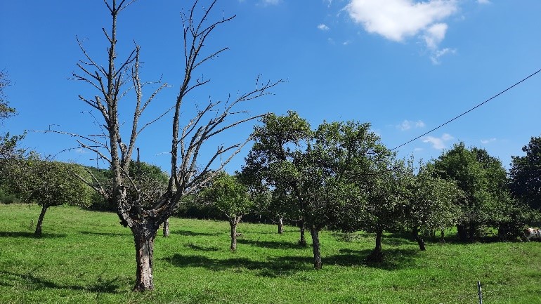 Ein Apfel, der sich vom Baum löst und in die Wiese fällt