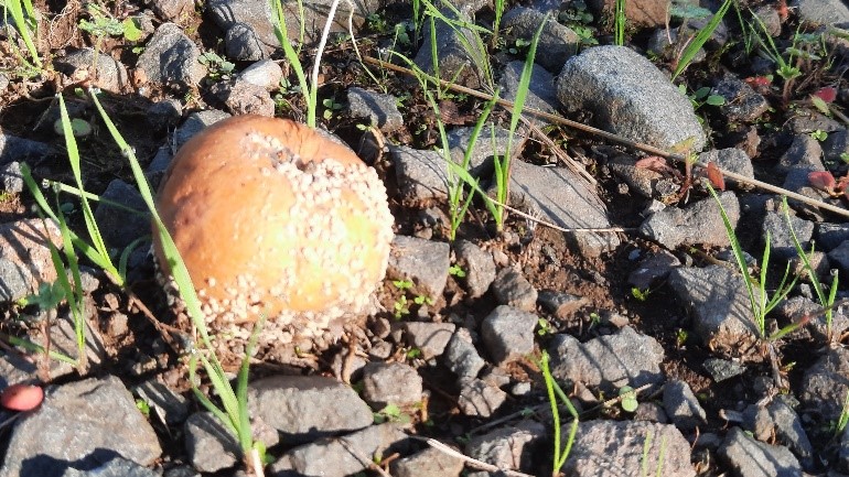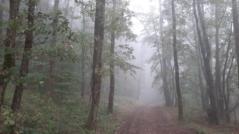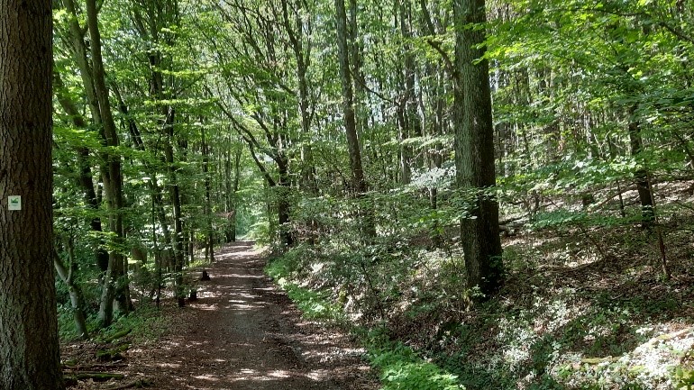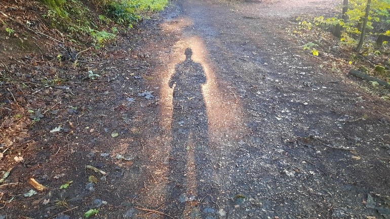 Im Kies des Waldweges sich nähernde knirschende Schritte