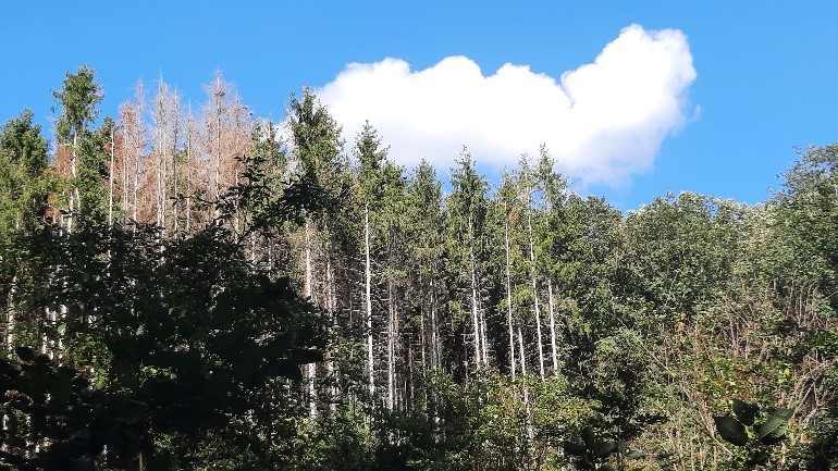 Das Knacken und Knischen des Reifens eines Mountainbikes auf dem Waldweg