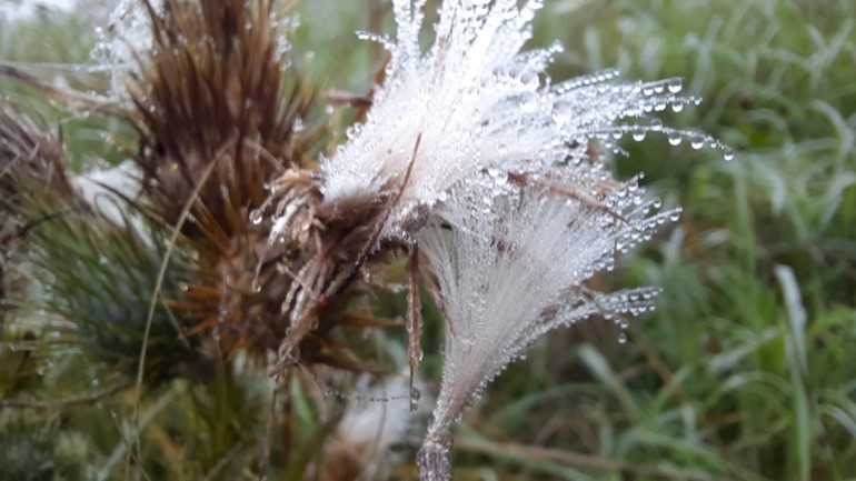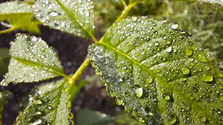 Die ersten Regentropfen, die auf Blätter fallen