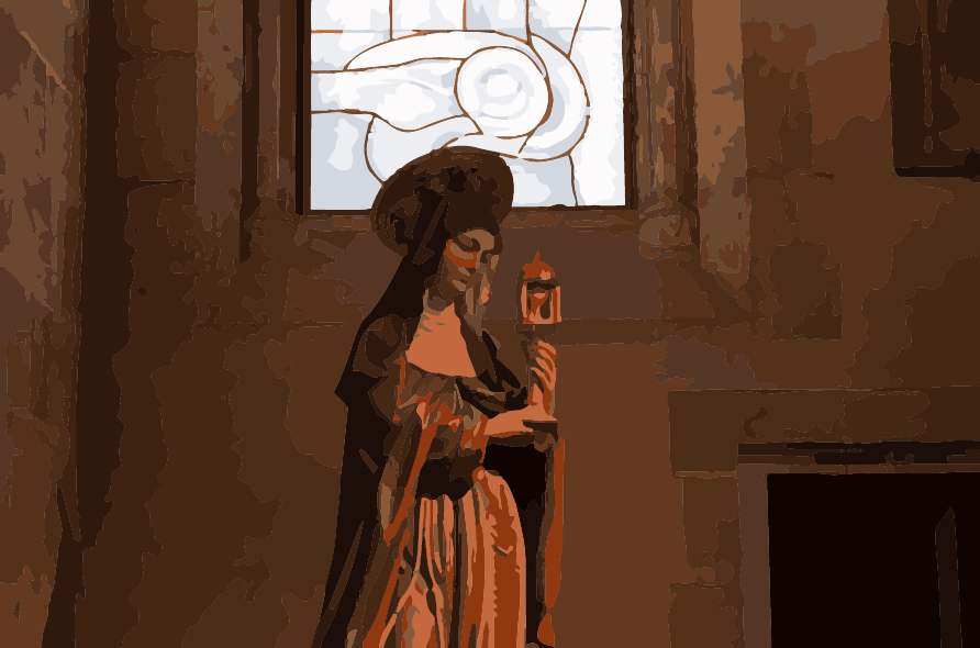 vielen Dank für Deine Nachricht. Die Monstranz als Zeichen der Stärke, die von Klara vorsichtig in Händen gehalten wird. Sie blickt voll Demut auf den Gegenstand, der ihr Stärke verliehen hat. Die naturalistische Gestaltung der Figur und das traditionelle Kircheninnere stehen im Kontrast zu dem modern gestalteten Fenster. Flächen in blassen Tönen erzeugen ein abstraktes Gebilde, das auf Geborgenheit und Schutz verweisen könnte.