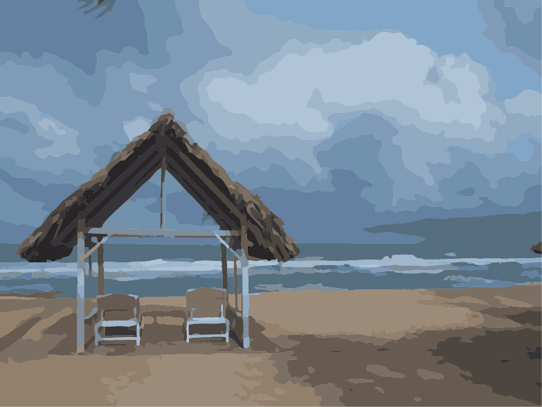 zwei überdachte Liegen am Meer. Das Dach wirft Schatten von der hochstehenden Sonne, während über das Wasser dunkle Wolken ziehen.