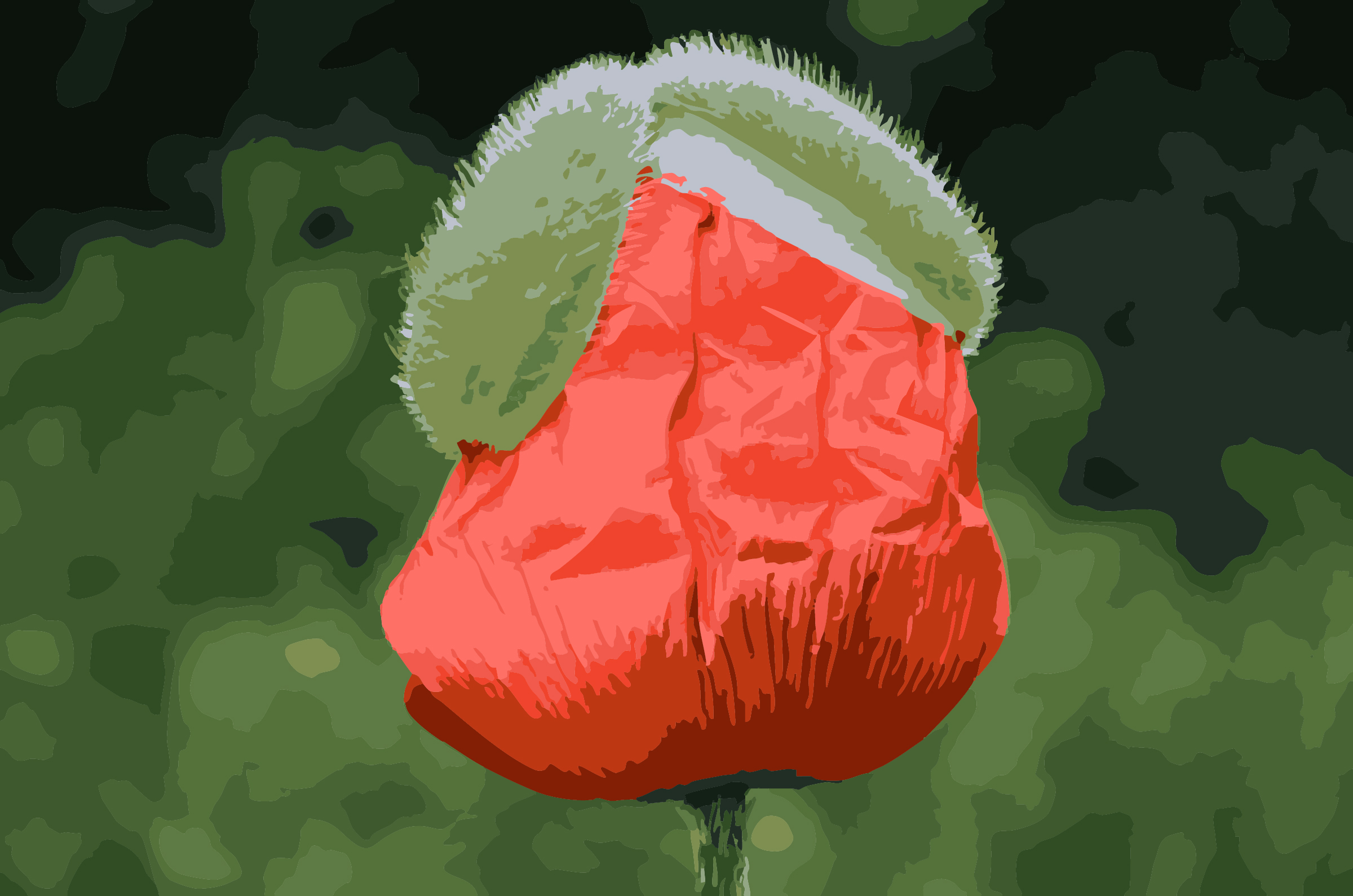 eine Mohnblume kurz vor dem Entfalten der Blüte. Die Knospe ist bereits gebrochen, die tiefroten Blütenblätter habe die grüne und stachelige Haut des Knospe bereits hochgeschoben. Nicht lange mehr und der Nicht mehr benötigte Schutzmantel wird abgeworfen sein. Deutlich wird die Kraft und das Ausmaß dieser Veränderung. Der Farbkontrast gibt an, dass eine neue Phase beginnt.