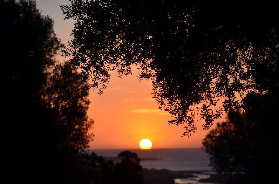ein Sonnenauf- oder untergang am Meer. Die Sonne steht kreisrund direkt über dem Horizont. Sie taucht den gesamten Himmel in ein sattes Rot-orange. Das Meer liegt regungslos da in einem matten Dunkelblau. Aus ihm ragt das Land empor, das an dieser Stelle kleine Buchten bildet, Felsen erkennbar sind, einen vielgestaltigen Übergang zwischen Wasser und Erde. Der Blick geht dabei durch eine reiche Vegetation aus Bäumen und Büschen mit üppigen Blattwerk. All das liegt in pechschwarzer Finsternis. In wenigen Minuten wird der Reiz der Situation vorüber sein, entweder ein neuer Tag erwacht oder eine Nacht emporgezogen sein.
