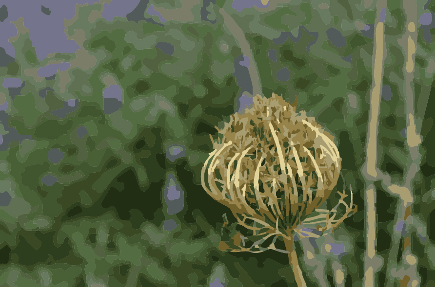 die vergangene Blüte einer Pflanze. Der Form nach wird es sich um einen Korbblüter handeln. Die jetzt sichtbaren verdorrten Fasern waren sicher einmal voller Vitalität gewesen, grüne Blätter mit Saft und Kraft. Aus dem Stengel zweigen zunächst seitliche schmale Blätter ab, dann die festeren Blätter, die vielleicht in ganz anderen Farben geleuchtet haben, schließlich das Fasergewirr im Inneren wie ein Nest aus feinadrigem Gewebe, vielleicht fast wie Baumwolle. Alles wirkt wie entfärbt vor dem Hintergrund frischen Grüns mit violetten Blüten.