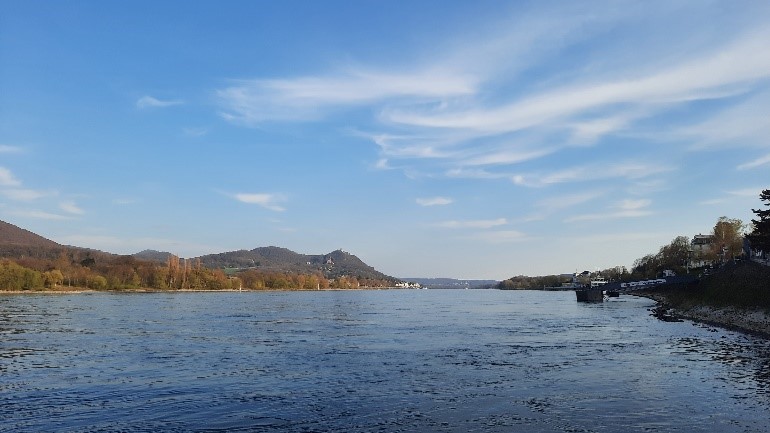 ein breiter Fluss mit einem Höhenzug im Hintergrund. Die Strömung verursacht auf der Wasseroberfläche an manchen Stellen ein Kräuseln. Ein Schiff ist nicht zu sehen. Am rechten Ufer, das im Schatten liegt, befindet sich eine Anlegestelle, was auf Schiffverkehr hinweist. Die Perspektive lässt fast auf einen See statt eines Flusses schließen. Der Höhenzug besteht aus mehreren Erhebungen und zeigt eine üppige Vegetation, deren Grün von der Sonne angestrahlt wird. Über allem thront ein blauer Himmel mit einigen wenigen Schleierwolken. Der Strom wirkt in seinen Ausmaßen mächtig.