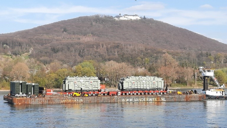 ein Schubverband mit zwei Groß-Apparaturen auf Fahrt über einen Fluss. Es scheint sich um einen Spezial-Transport zu handeln. Die Aggregate sind vielleicht vom Ort, an denen sie gefertigt wurden auf dem Weg zum späteren Einsatzort. Die Brücke des Schubschiffs scheint so beschaffen, dass sie flexibel auf die Höhe des Transportgutes angepasst werden kann. Die Wasseroberfläche des Flusses ist so glatt, dass sich das Schiff nicht in allen Einzelheiten, aber als Silhouette spiegelt. Auf der anderen Seite des Flusses erhebt sich ein dicht bewaldeter Berg mit einem ausladenden Gebäude auf dessen Gipfel. Von dort wird man einen guten Ausblick auf den Flussverlauf haben.