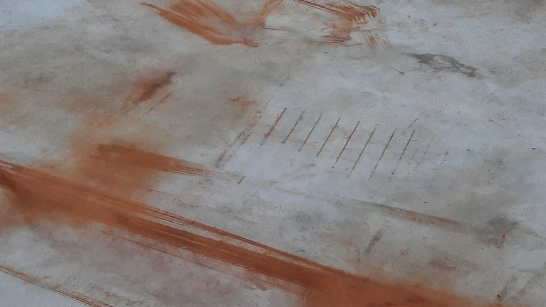 eine helle, matte Oberfläche mit abstrakten rötlich schimmernden Einfärbungen. Es handelt sich um schmale Linien, eine dickere Gerade, verbunden mit Flecken unterschiedlicher Größe und Intensität. Sie wirken wie Spuren von Gegenständen, die hier gelagert waren und der Witterung, vor allem Feuchtigkeit ausgesetzt waren. Es könnte sich um Rost handeln von Metallelementen, die hier auf dem Beton lagen. Manchmal ist es wichtig, die Vorgeschichte zu kennen, um eine zutreffende Einschätzung abgeben zu können.