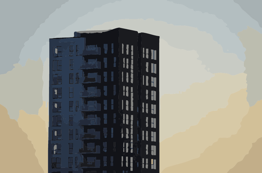 ein Hochhaus in abendlicher oder morgendlichen Dämmerung. In den Fenstern, die im Licht liegen, spiegelt sich der rötlich gefärbte Himmel. Die andere Fassadenseite liegt im Schatten. Die neun sichtbaren Etagen wirken vollkommen identisch, keinerlei Abweichungen sind erkennbar. Durch die Beschaffenheit des Gebäudes, der Perspektive und vermeintlichen Distanz lässt sich erahnen, dass das Haus über viele weitere Geschosse verfügt, ein echtes Hochhaus. Der Himmel ist vollkommen wolkenlos und der Farbverlauf reicht von einem blassen blau-grauen Zenit zu einer rötlichen Tönung am Horizont.