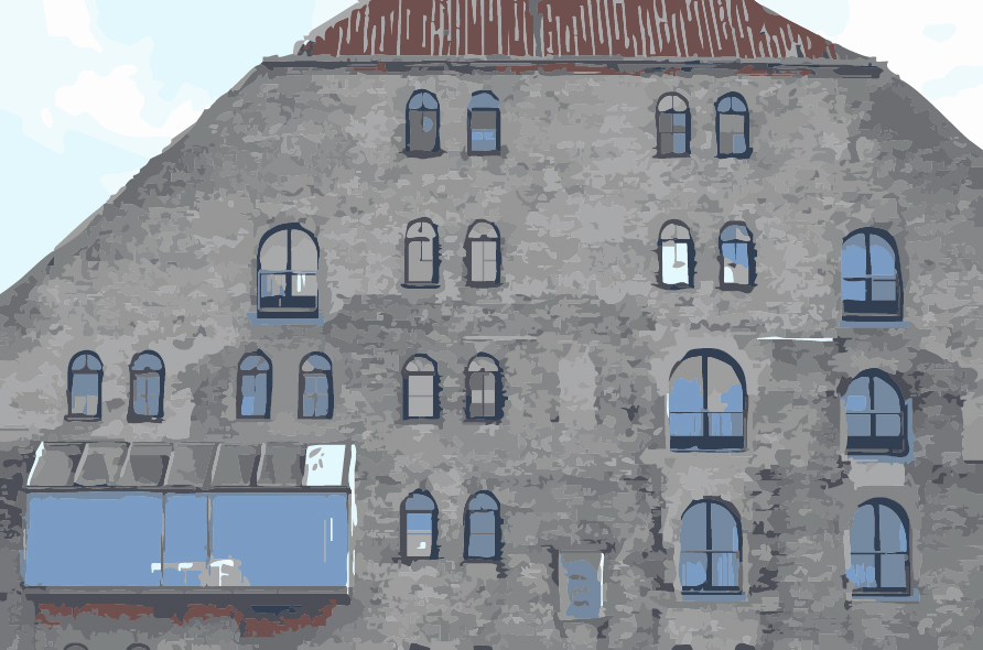 die Fassade eines opulenten, alten Gebäudes. Die Backstein-Front weist einige Besonderheiten auf: Die Backsteine sind in einigen Bereichen unterschiedlich gefärbt, was auf Umbauten im Laufe der Zeit hinweist. Es existieren viele in Größe und Form unterschiedliche Fenster. Einige wirken wie nachträglich eingebaut. An anderen Stellen wurden Ehemalige Fenster durch Mauerwerk ersetzt. Auffällig und ebenfalls wie eine nachträglich Ergänzung wirkt ein Glaserker, der sich aus der Fassade herauswölbt und im Inneren die Möglichkeit eines Panoramablicks ermöglicht. Das Gebäude findet oben seien Abschluss in einem Walmdach, das mit roten, sehr regelmäßigen Dachziegeln gedeckt ist.