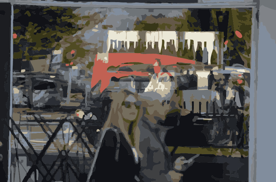 zwei Passanten vor einem Schaufenster. Ein Mann und eine Frau haben ihren Blick geradeaus, bzw. der Straße zugewandt. Das Schaufenster scheint sie nicht zu interessieren. In dem Schaufenster spiegelt sich die Straßenszenerie: die Fahrbahn mit vorbeifahrenden Autos, Personen an Tischen und unter Sonnenschirmen als Besucher einer Außengastronomie. Auch Bäume und ein Stück Himmel spiegeln sich im Glas. Gleichzeitig der Blick nach innen: der Gastraum eines Lokals mit einem Tresen, dahinter der Wirt mit unzähligen Flaschen in einem Regal hinter ihm an der Wand. Es ist nicht einfach zu sagen, was zu welcher Dimension, dem Drinnen oder dem Draußen gehört.