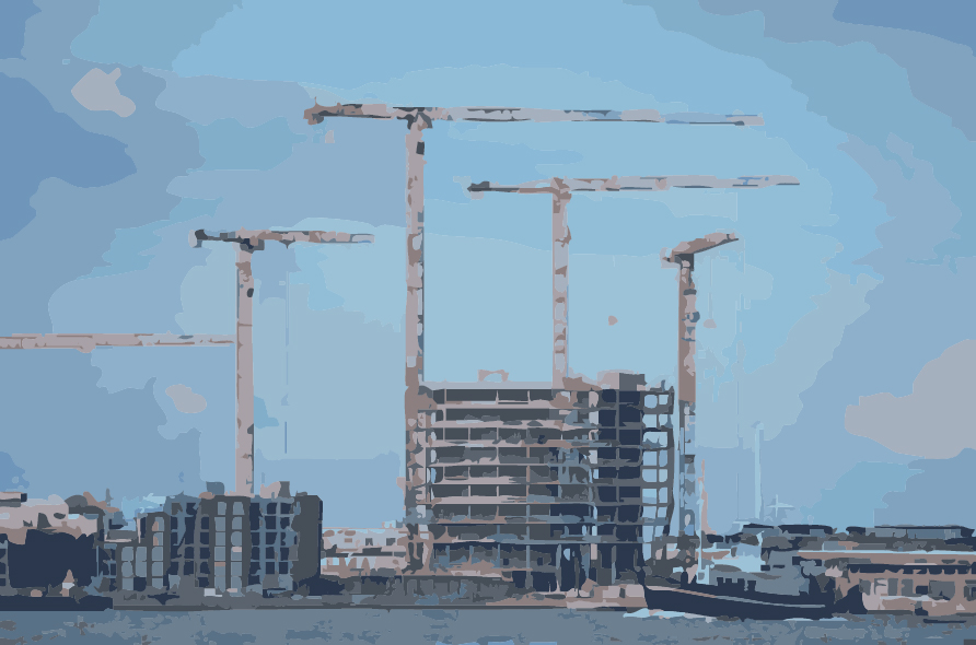 eine Großbaustelle. Mindestens fünf hohe Baukräne ragen in den Himmel. Errichtet werden in unmittelbarer Nähe zueinander angeordnete Hochhäuser. Zwei Rohbauten sind sichtbar, einer mit rund zehn Etagen, einer mit derzeit fünf Stockwerken. Es kann vermutet werden, dass sie noch höher wachsen werden. Die Höhe der Kräne lassen dies wahrscheinlich erscheinen. Die Bauten bestehen aus den einzelnen Decken zwischen den Etagen und wichtigen Innenwänden. Sie lassen teilweise einen Blick frei durch die Räumlichkeiten.