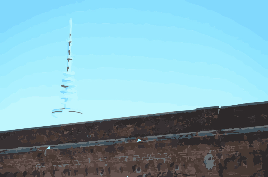 eine Mauer und hinter der Mauer, in weiter Entfernung, ein Funkturm. Die Mauer aus Backsteinen errichtet in typisch braun-rötlicher Färbung, alt und in die Jahre gekommen, vermutlich ein Teil einer historischen Industrieanlage. Der Funkturm dagegen im strahlendem Weiß mit einer ausgebauten Ebene mit rundherum befindlichen Fenstern, vielleicht ein Restaurant mit Aussicht. Darüber einige Plateaus mit Sendeanlagen und als Spitze eine rot-weiße Antenne. Das Ganze verströmt Modernität und verbindende Technik, einen Fortschritt im Vergleich zu den alten Mauern.