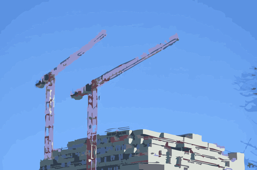 ein wuchtig wirkendes Gebäude mit zwei Baukränen. Sichtbar sind die oberen Etagen eines Hochhauses. Anders als in vielen Fällen wirken die Geschosse sehr massiv. Auf der von der Sonne beschienenen Seite sind breite Betonbänder sichtbar, während die Fenster vergleichsweise klein erscheinen. Auf der Schattenseite scheint sich dies zu wiederholen. Die beiden Kräne sind im Ruhezustand. Ihre Ausleger sind vom Wind in die gleiche Richtung gedreht. Als Gegensatz zur Technik und zum Gebäude ist rechts ein Teil einer Baumkrone erkennbar. Das Ganze vor einem blauen, wolkenlosen Himmel.