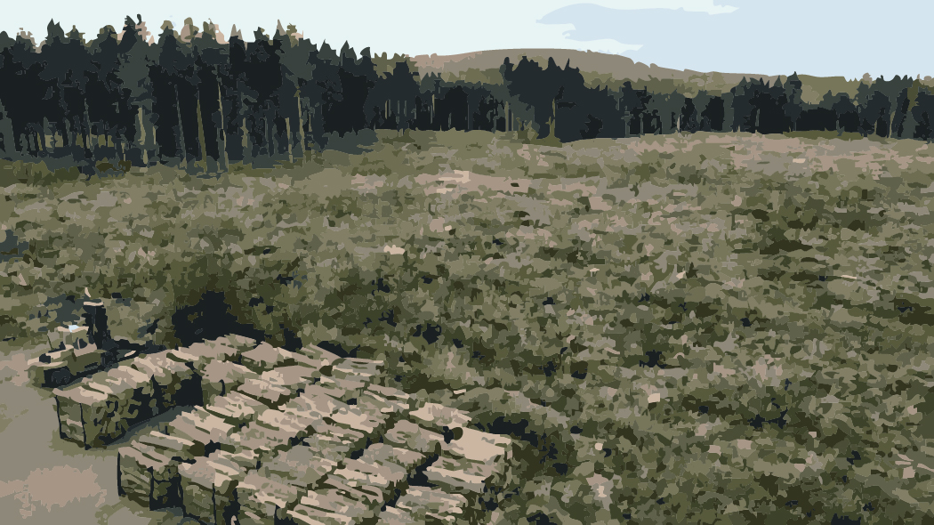 in einem Wald eine riesige gerodete Fläche. Sämtliche Bäume sind entfernt. Nur die Stümpfe sind übrig geblieben. Auch jegliche andere Vegetation scheint verschwunden. Im Vordergrund ein Platz mit Stapeln von akkurat in eine Länge geschnittenen Stämmen. Sie warten offenbar auf den Abtransport. Ein Gabelstapler steht bereit, um die Verladung durchzuführen. Anderes Großgerät scheint abgezogen und andernorts im Einsatz. Ein Bild einer massiven Zerstörung. Am Rand und auf einem Höhenzug im Hintergrund ist dagegen dichter und intakter Wald zu sehen.