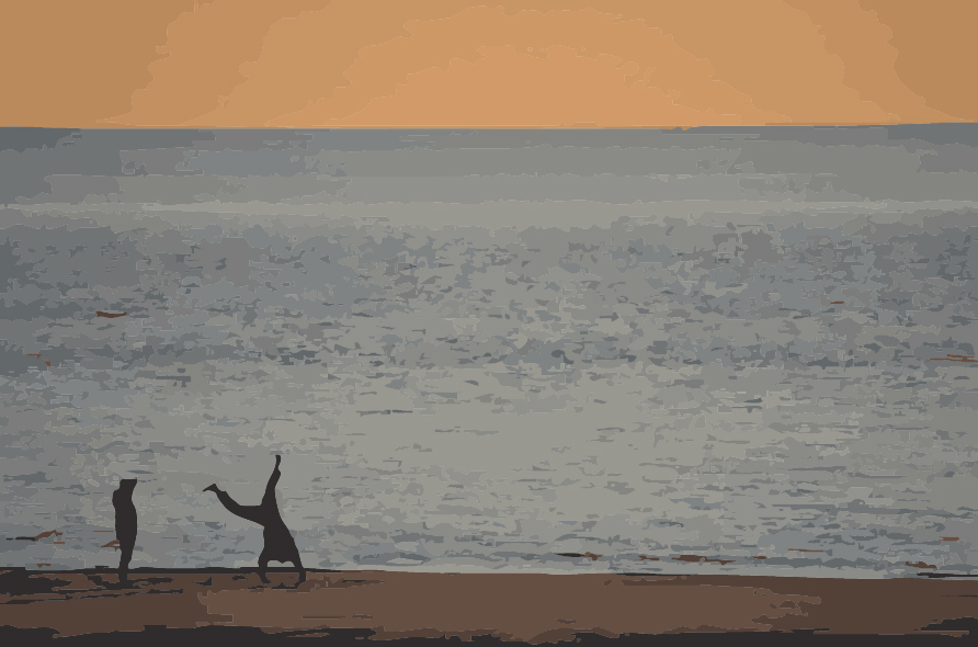 zwei Gestalten an einem weitläufigen Strand. Direkt vor dem Wasser vollführt eine der Personen einen Radschlag, während die andere Person der Turnübung zuschaut. Während Strand, Meer und Himmel reine und ruhige Natur darstellen, repräsentieren die beiden Personen Aktivität und Dynamik. Sandstrand, Wasser und Himmel bilden jeweils monochrome Flächen in den Farben Orange, Blau und Ocker. Die Personen sind dunkel gekleidet und wirken wie Scherenschnitte. Die Szene begibt sich im Übergang zwischen Tag und Nacht.
