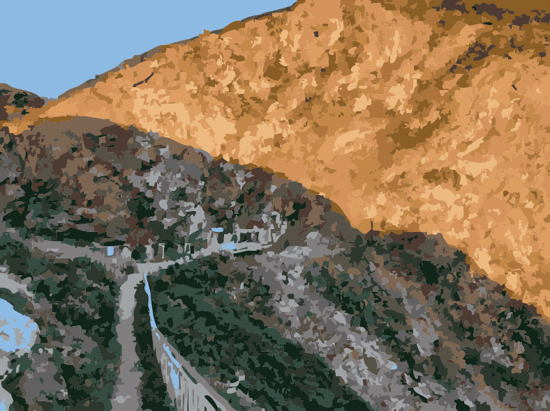eine besondere Bergszenerie mit Licht und Schatten. Der Gipfel des einen Berges wirft bei tief stehender Sonne seinen Schatten auf die Flanke des anderen Berges. Der Kontrast zwischen Hell und Dunkel ist so groß, dass auch Details zu erkennen sind: zwei Gestalten auf einem Absatz tauchen als Schatten auch auf dem felsigen Untergrund des Nachbar-Berges auf. Der mit einem Geländer versehene Bergweg führt an die Grenze von Licht und Schatten. So können Dinge in weiter Entfernung ihren Widerhall finden.