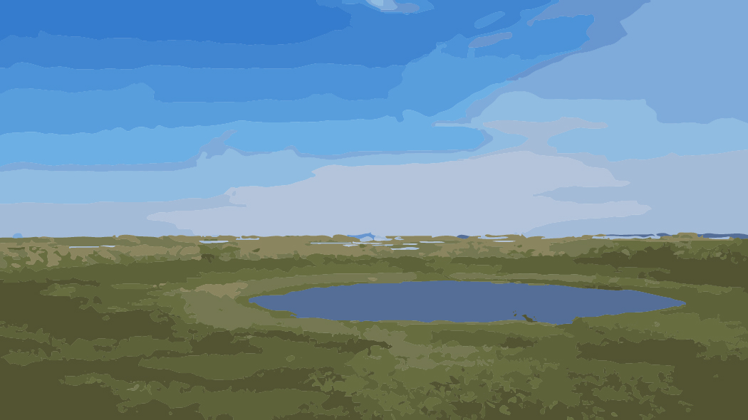 ein kreisrunder Tümpel in einer kreisrunden Senke. Der Rand der Senke scheint von Menschenhand angelegt. Der Boden ist durchgängig mit Gras bewachsen. Es weist verschiedene Areale mit unterschiedlicher Grünfärbung auf. So kurz wie es ist, scheint das Gras gemäht zu werden. Das Blau des Tümpel weist ebenfalls Farbnuancen auf. Darüber ein hellblauer Himmel mit einigen Schleierwolken. Ein Ensemble aus Formen und Farben, auf das Menschen nur indirekten Einfluss nehmen. Die Erde ist braun oder, wenn es sich um Stein oder Fels handelt, grau, die Vegetation ist grün, Himmel und Gewässer blau.