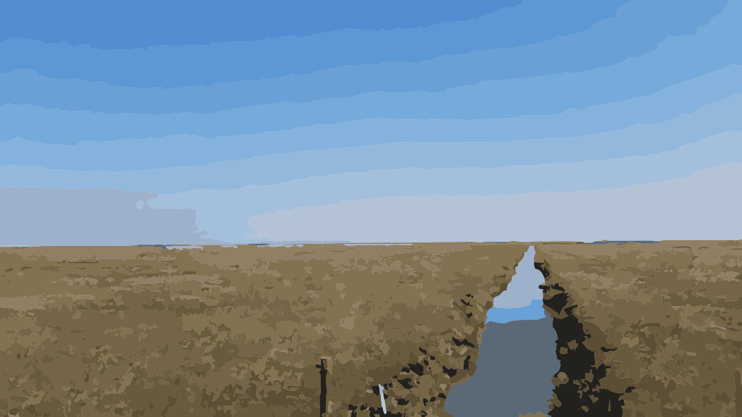 plattes Land mit dürftiger Vegetation, durchlaufen von einem Entwässerungsgraben. Die Landschaft wirkt wie die am Meer weit verbreiteten Marschen mit ihren endlosen Flächen, die landwirtschaftlich genutzt werden. Von Menschen werden sie für die Nutzung gestaltet. Der Graben ist von Menschen angelegt und verläuft schnurgerade bis zum Horizont. In seinem stehenden Wasser spiegelt sich der blaue Himmel. Wie ein Riss durchläuft der kleine blaue Kanal die grüne Monotonie. Am Himmel zeigt sich kein Wölkchen.